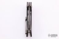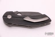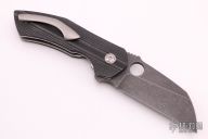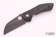 This Taco XL flipper from Nick Swan features a dark tumble finished blade with "Spydie" hole, and notched thumbrest and flipper. The handle has black Ultrex micarta scales with titanium pivot collars, satin finished titanium liners and clip that is positioned for tip up carry and has hidden screws. Blade is centered when closed, flips well with no wrist action needed, and locks up with no play. Comes with cloth pouch and COA dated 8/2021. New from maker at the 2021 USN Gathering.
