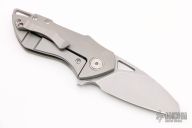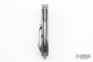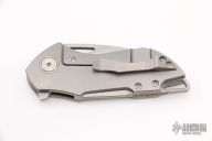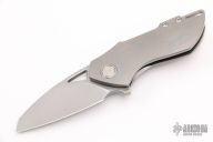 This Riverstone by Grissom Knife and Tool features a stonewash finished blade with notched thumbrest and flipper. This handle has a stonewashed titanium frame, backspacer and pocket clip, satin finished titanium collars and hardware. Stainless steel lock insert, ceramic ball bearings and detent. Stainless steel standoffs, blade stop and pivot. Comes with original box and zippered case. New from maker. S/N may differ from pictures. This knife is one of 50.