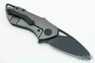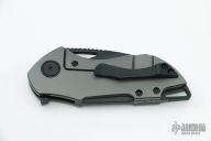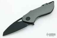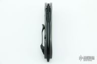 This Riverstone by Grissom Knife and Tool features a black PVD blade with notched thumbrest and flipper. This handle has a grey PVD titanium frame, black backspacer, pocket clip, pivot collars and hardware. Stainless steel lock insert, ceramic ball bearings and detent. Stainless steel standoffs, blade stop and pivot. Comes with original box and zippered case. New from maker. S/N may differ from pictures. This knife is one of 55.