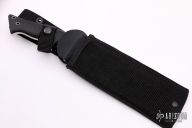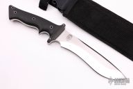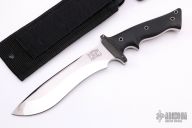 This Merrill's Marauder by Walter Brend features a drop point recurve mirror finished blade with false top edge and satin finished flats, .260" blade stock and 1.679" blade depth, full tang construction. The handle has nicely contoured black canvas micarta scales with hollow tube pins. Comes with black nylon sheath. Comes with a zippered case. Excellent condition.