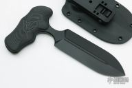 This Push Dagger by Allen Elishewitz features a black double edged blade with .195" blade stock and 1.274" blade depth, full tang construction with black G-10 scales. Comes with a kydex sheath and a green G-10 trainer. Excellent condition.