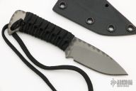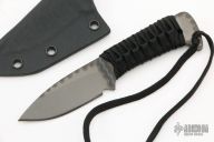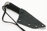 This neck knife by Strider features a flamed and anodized blade with .145" blade stock and .960" blade depth, full tang construction with cord wrapped handle. Comes with a kydex sheath. Excellent condition.