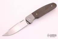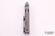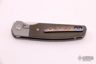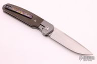 This Caballero by Enrique Pena features a hand rub satin finished drop point blade with swedge, notched thumbrest and dual thumbstuds. The handle has a blasted titanium frame with mokuti tip up clip, green canvas micarta scales. Includes padded and zippered case. Nice detent, lockup and blade seating. New from maker.