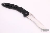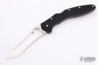 This Ulize from Spyderco features a satin finished recurve blade with thumbhole and notched thumbrest. The handle has black G-10 scales, stainless steel liners and backspacer, and a black 4-way reversible black coated stainless steel clip. Comes with original box and papers. Has a couple marks on the clip, otherwise excellent condition.
