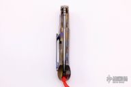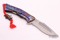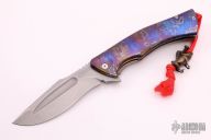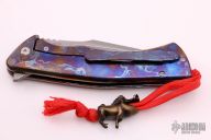 This S5 "Southern Star" is an impressive collaborative knife design from Zieba Knives and Jason Knight. Its rounded titanium frame lock handle is contoured for comfortable use, and has a "Smoke Blue" anodized finish. The knife sports a unique harpoon style recurve blade with stylized grooves and a flipper tab. The knife comes complete with a machined titanium pocket clip for secure tip-up carry. Features: M390 blade steel offers superb edge retention and wear resistance. Titanium handle construction provides a durable, lightweight frame. Steel lock bar insert for secure over-travel protection. Ceramic ball-bearing pivot makes blade deployment a snap. Comes with original box and COA dated 5-20-18. Excellent condition.