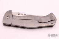 This XL Hydra from Les George features a hand rub satin finished recurve blade with dual thumbstuds. The handle has a tumbled titanium dovetailed bolster, liner and frame with a carbon fiber scale, a tumbled titanium tip up clip. Lanyard hole. Nice detent, lockup and blade seating. Comes with a zippered case. Excellent condition.