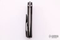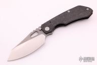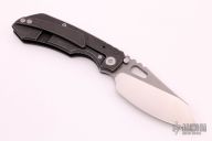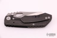 This Evolution 2.0 by Custom Knife Factory features a satin finished blade with notched thumbrest and thumbhole. The handle has a marble carbon fiber and black bark finished titanium frame with a matching tip up clip and backspacer. Comes with velcro case and COA. Nice detent, lockup and blade seating. Excellent condition. #114