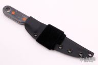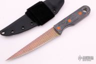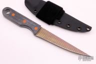 This Fillet Knife by John Gray features a laser engraved titanium blade with a right-hand chisel ground blade, .035" blade stock and 1.011" blade depth, full tang construction. The handle has black canvas micarta scales with orange G-10 pins and a large lanyard hole. Comes with a kydex sheath with Velcro loop. New from maker at the 2021 USN Gathering. This knife has alot of flex in the blade!