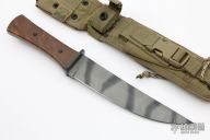 This Fighter by Duane Dwyer features a tiger stripe finished blade with .284" blade stock and 1.604" blade depth, hidden/frame tang construction. The handle has a flamed titanium guard, black wood frame and wood scales. Comes with an Eagle Brand nylon sheath. Excellent condition. Comes with a velcro case.