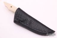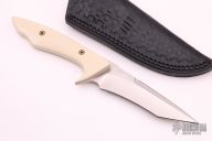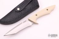 This Tanto by Jerry Hossom features nicely shaped ivory paper micarta scales with mosaic pins. Hand rubbed satin finished tanto blade with notched thumbrest and sharpened top edge, .140" blade stock and 1.301" blade depth, full tapered tang construction. Fits nicely in hand. Comes with a hand tooled black leather sheath. Excellent condition.
