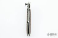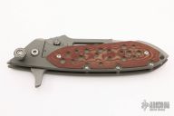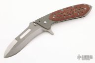 This large Framelock Flipper by Steve Ryan features a two-tone blade with thumbhole, flipper and notched thumbrest. The handle has a bead blasted titanium frame with red linen micarta overlays. Nice detent, lockup and blade seating. Comes with a zippered case. Has some light scratches, otherwise excellent condition.