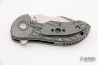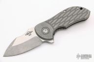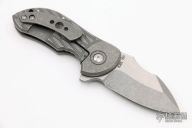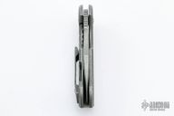 This Production Gordo flipper by Peter Carey features a two-tone blade with notched thumbrest and flipper. The handle has a tumbled and tread milled titanium frame with matching tip up clip and backspacer. Caged bearings. Nice detent, lockup and blade seating. New from maker.