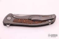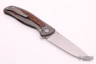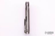 This F95NL framelock from Shirogorov features a flat ground tumble finished blade with notched flipper. The handle has a tumble finished titanium frame with black/orange crazy micarta inlay complimented by a matching tip up clip and a single titanium barrel spacer at the butt along with a lanyard hole. Excellent lockup, strong detent, and nice seating. Includes the original box and papers. Excellent condition.