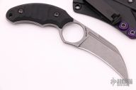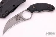 This Harpy by Bastinelli Knives is a Fred Perrin design, it features a stonewashed blade with fullers and notched thumbrest, .160" blade stock and 1.210" blade depth, full tang construction. The handle has custom black G-10 scales. Comes with a kydex sheath with belt clip and zippered case. New from maker at the 2021 USN Gathering.