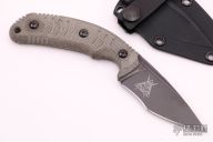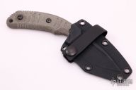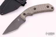 This Askari by Bastinelli is a DB Boon design, it features a dark stonewashed blade with fullers and notched thumbrest, .167" blade stock and 1.163" blade depth, mortise tang construction. The handle has green canvas micarta grip. Comes with a kydex sheath and original hard case. New from maker at the 2021 USN Gathering.