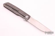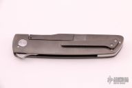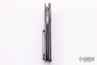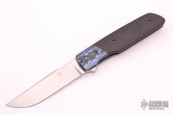 This Borg Flipper by Jason Clark features a satin finished blade with a notched thumbrest and flipper. The handle has a black timascus dovetailed bolster, carbon fiber scales, bead blasted titanium liner and frame, satin finished floating stainless steel backspacer, tip up titanium clip. Rides on IKBS, nice detent, lockup and blade seating. Comes with a leather slip sheath and COA. New from maker at the 2021 USN Gathering.