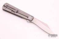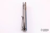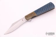 This Barlow Flipper by Jason Clark features a hand rub satin finished blade with a notched flipper. The handle has a green canvas micarta dovetailed bolster, Blue Fin G-Carta scale, bead blasted titanium liner and frame, satin finished floating stainless steel backspacer, tip up titanium clip. Rides on IKBS, nice detent, lockup and blade seating. Comes with a leather slip sheath and COA. New from maker at the 2021 USN Gathering.