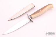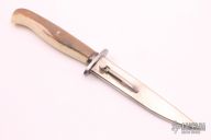 This Slim Fighter by Master Smith Bailey Bradshaw features a hand rub satin finished blade with .095" blade stock and .750" blade depth, hidden tang construction. The handle has a stainless steel guard and a fossil walrus ivory grip. Comes with a nickel silver scabbard with adjustable clip and a zippered case. Has a couple light spots on the blade, and some light scratches on the guard and sheath, otherwise excellent condition.