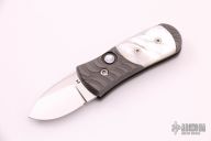 This Butter Bean Coil spring auto by Z Custom knives features a mirror polished blade. The action is fast and strong. Filework on blade spine and stainless steel backspacer. Bead blast titanium frame is milled and has mother of pearl inlays on the frame and push button. The Butter Bean is the smallest automatic from Chris English and the perfect size for every day carry. Excellent condition.