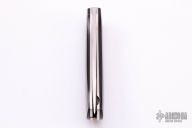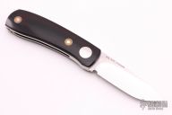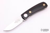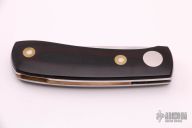 This Barry Wood swing lock folder features a mirror finish blade and satin finish stainless steel frame with black linen micarta scales. This is a very unique scissor opening folder, which when the blade is fully open and locked in place is almost a fixed blade knife. The handle is nicely contoured for a comfortable grip. Opening is accomplished by lighting pressing down and outward at the rear indentation on the spine, which releases the locking pin and allows one side of the handle and the blade to rotate down then forward until the blade locks in the forward position. The one side of the handle continues to rotate back until it locks in place. Closing requires the same slight thumb pressure at the indentation to release the locking pin, then the one side of the handle is rotated back and around, catching the blade and aligning both with the other side of the handle in a locked closed position. Has some light scratches otherwise excellent condition.
