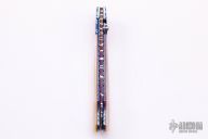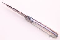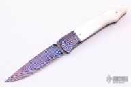 This LL19 linerlock folder by Andre Thorburn features a blued Damascus blade with a single mother of pearl inlaid thumbstud. The handle has matching blued Damascus bolsters, mother of pearl scales with red liners, anodized and fileworked titanium liners, and a stainless steel backspacer. Dated 2004 inside backspacer. Nice detent, lockup and blade seating. Excellent condition.