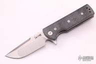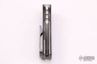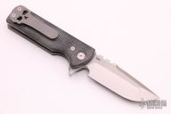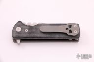 This Chaves T.A.K. features a satin finished drop point blade with the Chaves logo and a notched thumbrest. The handle has black canvas micarta scales, tumbled titanium liners and a matching reversible skull pocket clip. Comes with original box. Excellent condition.