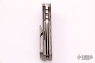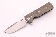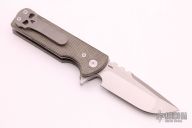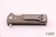 This Chaves T.A.K. features a satin finished drop point blade with the Chaves logo and a notched thumbrest. The handle has green canvas micarta scales, tumbled titanium liners and a matching reversible skull pocket clip. Comes with original box. Excellent condition.