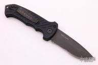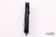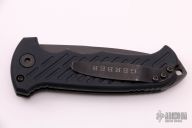This 06 Side Opening Auto has a matte black finished S30V drop point blade. Handle is black aluminum over black stainless steel liners, exposed stainless steel tang butt/ glass breaker/ backspacer with lanyard hole, black stainless steel tip up (RH/LH reversible) clip, and safety button. Has some light scuffs, otherwise good condition.