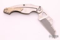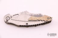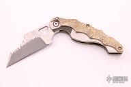 This Phantom Steel Works Skin Walker has a two-tone finished wharncliffe blade with textured flats, thumb hole, and notched thumbrest. The handle has a textured titanium frame with mokume overlay and tip up clip. Nice detent and blade seating, has a little vertical blade play. Excellent condition, shows no signs of use.
