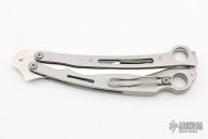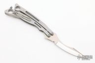 The Szabofly by Spyderco is no longer in production, if features a satin finish blade with swedge. The handle has bead blasted stainless steel handles with a spring loaded latch and a tip up reversible clip. Has a couple small spots on the handle, otherwise excellent Condition. Comes with original box.