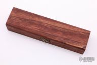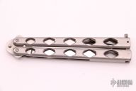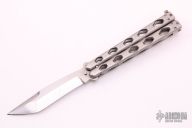 This balisong by Matt Cook features a satin finished blade. The handle has titanium handles with matching T-latch. Has some scratches, otherwise good condition. Comes with a wooden box.