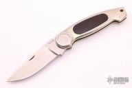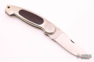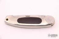 This Button Lock Folder from Jimmy Lile features a satin finished blade with nail nick, #242 on blade. The handle has a nickel silver frame with wood inlays. Large button lock release mechanism used to open and close the knife. Numbered "79" on inside of backspacer. Has some scratches and some staining on the blade, otherwise good condition.