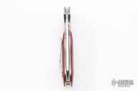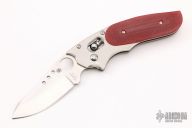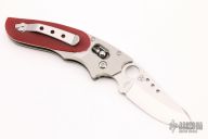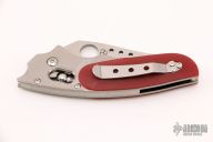 This Phoenix by Spyderco is a Howard Viele Design. The blade is satin finished with thumbhole opening. The handle has a titanium frame with red G-10 scales, stainless steel backspacer, and a tip up stainless steel clip. Excellent condition. Comes with original box and papers. Still has protective covers on the handle.
