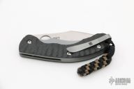 This Perrin PPT from Spyderco has a satin finished drop point blade with thumb hole and notched thumb rest. Handle is carbon fiber over bead blasted stainless steel liners and backspacer. Bead blast stainless steel tip up clip. Excellent condition. Comes with original box and papers.