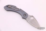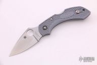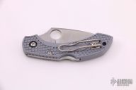 This Dragonfly II by Spyderco features a satin finished blade with thumbhole and notched thumbrest, Super Blue Core with 420J1 stainless steel clad. The handle has grey FRN scales, stainless steel backspacer, and a tip up clip, left or right reversible. Excellent condition. Comes with original box and papers.
