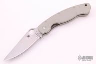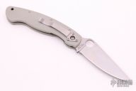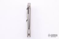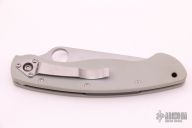 This Military Liner Lock has a satin finished blade with notched thumb rest and thumb hole. Handle is grey G10, with stainless steel single liner (lock), black fiber back spacer, black stainless steel tip down clip, and lanyard tube pin. Excellent condition. Comes with original box and papers.