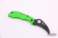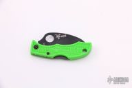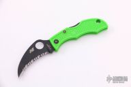 This Ladybug by Spyderco is a special limited edition for the USN. It features a black fully serrated blade with notched thumbrest and a thumbhole. The handle has a green FRN handle with black stainless steel backspacer. Comes with original box and papers. Excellent condition.