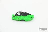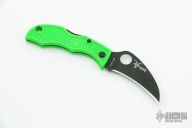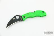 This Ladybug by Spyderco is a special limited edition for the USN. It features a black blade with notched thumbrest and a thumbhole. The handle has a green FRN handle with black stainless steel backspacer. Comes with original box and papers. Excellent condition.