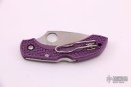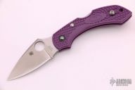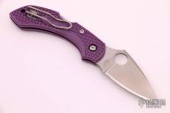 This Dragonfly II by Spyderco features a satin finished blade with thumbhole and notched thumbrest. The handle has purple FRN scales, stainless steel backspacer, and a tip up clip, left or right reversible. Comes with original box and papers. Excellent condition.