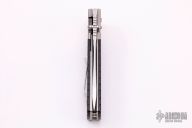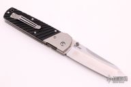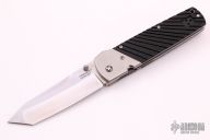 This Hatamoto linerlock by Cold Steel has a high satin finished San Mai III stainless steel tanto blade with dual thumb studs and notched thumb rest. Handle is black G10 over titanium liners and satin finished titanium bolsters. Stainless steel tip up reversible clip and lanyard hole. Excellent condition. Some scratches on the bolsters and blade, otherwise good condition. Comes with original aluminum case.