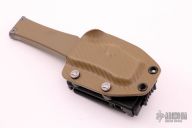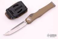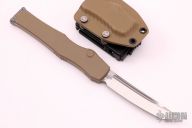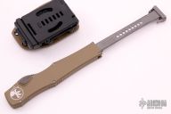 This Halo VI by Microtech knives features a satin finished tanto blade with fullers and satin flats. The handle has a tan aluminum frame with blasted stainless steel hardware and charging handle. Dated 09/2018 and #2416. Excellent condition. Comes with original box, sheath and papers.