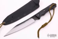 This Sticker by GHK features a blade made from a selectively hardened and triple tempered old Oberg file, .219" blade stock and 1.206" blade depth, full tang construction with black micarta scales. Comes with a kydex sheath. New from maker.