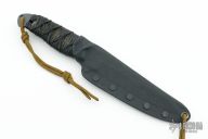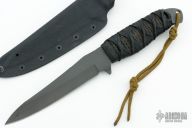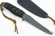 This Shiv by GHK features a blade made from Austrian D-2 Tool Steel with a notched thumbrest.  .186" Blade Stock.  1.182" Blade Depth.  The handle features cotton cord & nylon cord covered in marine Phenolic resin.  Includes a black kydex sheath.  New from maker.