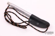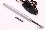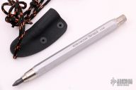 This spike pen features a black oxide finished spike that is deployed by pressing the button at the rear of the pen. This pen has been internally modified to accept and eject the spike with the push of the rear button. A piece of pencil graphite is positioned at the tip to conceal the spike. Works as a functioning pencil. New from maker. Very cleaver. Comes with a kydex neck sheath.
