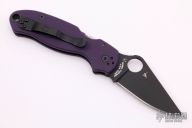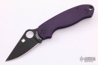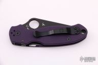 This Para 3 by Spyderco features a black finished clip point blade with thumb hole and notched thumbrest. CPM Cruwear Blade Steel. The handle is comprised of purple G-10 frame over nested steel liner and stand-offs. The steel pocket clip is 4 way adjustable. Includes original box and paperwork. Excellent condition.
