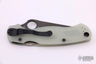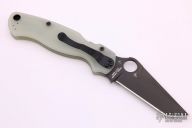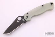 This G81GM4BKP2 Paramilitary 2 by Spyderco features a black tanto blade with thumb hole, notched thumb ramp and choil. The handle has a textured jade G10 scales over a stainless steel subframe and lockbar. 4 way adjustable pocket clip and lanyard tube in pommel. Includes original box and paperwork. Excellent condition.