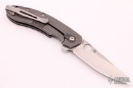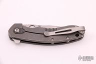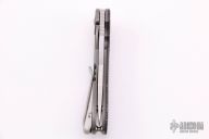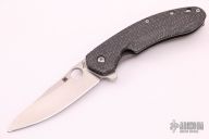 This framelock flipper by Spyderco features a stonewashed blade with a notched thumbrest, thumbhole, and flipper. The handle has a custom silver lightning strike carbon fiber scale, stonewashed titanium liner and frame with silver lightning strike carbon fiber around the pivot screw and a custom titanium clip, tip up carry. Has some light scratches on the clip, otherwise excellent condition. Comes with original box and papers. Comes with original brown G-10 scale and a custom green C-Tek scale.