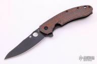 This frame-lock flipper by Spyderco features a black coated blade with a notched thumbrest, thumbhole, and flipper. The handle has a custom red/black silver lightning strike carbon fiber scale with a black coated titanium liner and a black coated titanium scale with red/black silver lightning strike carbon fiber around the pivot screw and a stainless steel clip, tip up carry. Comes with original black G-10 scale, box and papers. Excellent condition.
