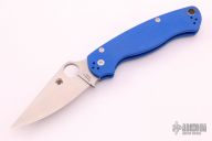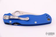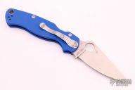 This Paramilitary 2 from Spyderco has a satin finished clip point blade with thumb hole and notched thumb rest. Handle is blue G-10 with stainless steel liners and stainless steel 4-way reversible clip. Excellent condition. Comes with original box and paperwork.