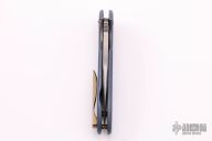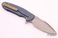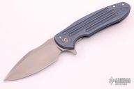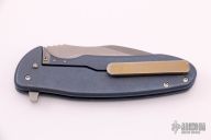 This Fortis by Ferrum Forge features a tumbled drop point blade with swedge, notched thumbrest and flipper. The handle is comprised of a milled, tumbled and anodized titanium frame over anodized barrel spacers. The anodized and orange peel finished titanium pocket clip is positioned for right hand, tip up carry and has hidden screws. Has a couple light scuffs, otherwise excellent condition.